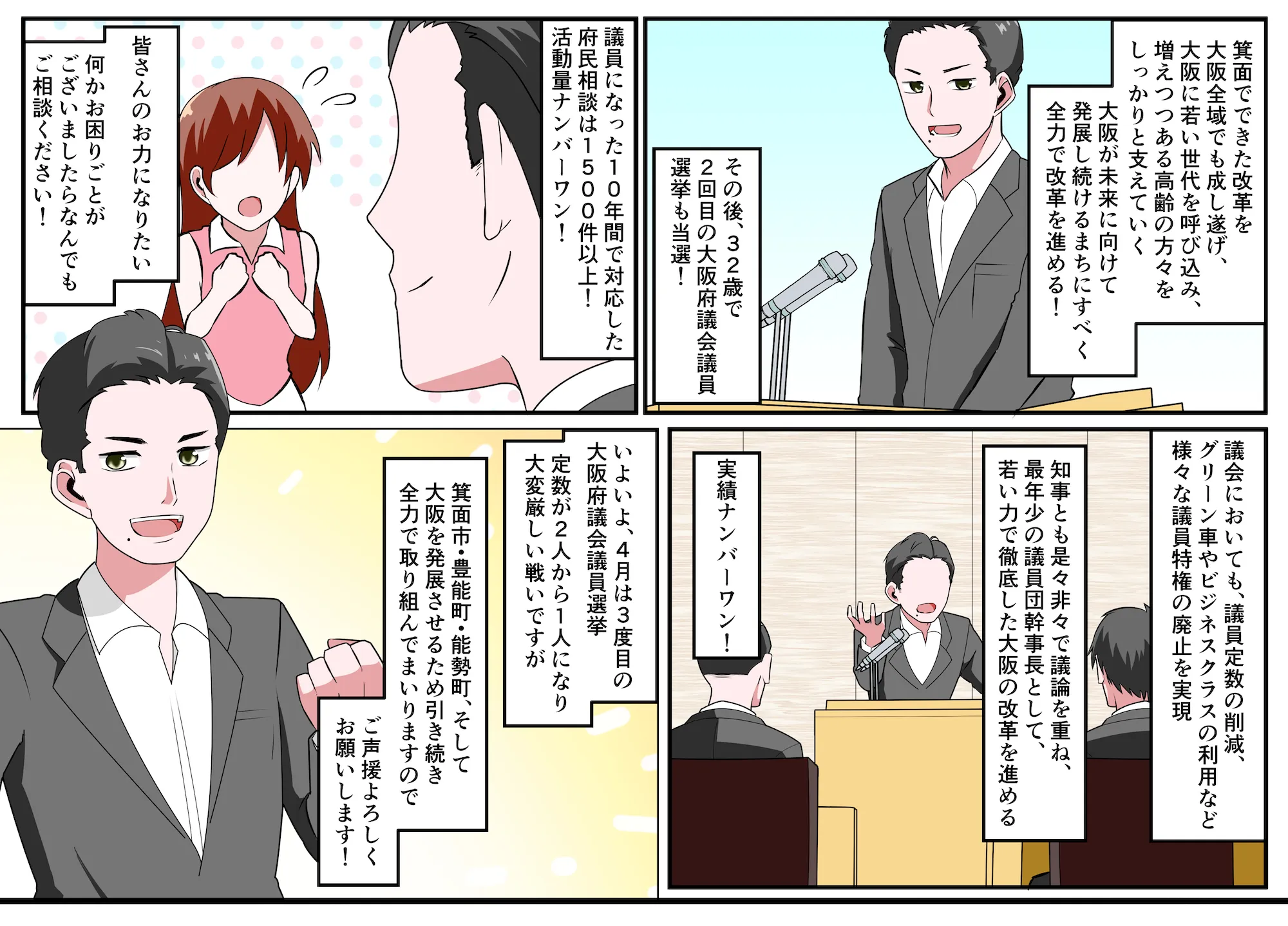 まだまだ未熟ではありますが、私はこれからのまちを考えたときに、若い力が絶対に必要であると信じております。箕面でできた子育て支援の拡充と教育改革の徹底、これを大阪府全域でも成し遂げ、大阪に若い世代を呼び込み、増えつつある高齢の方々をしっかりと支えていく。大阪が未来に向けて発展し続けるまちにしてまいります。